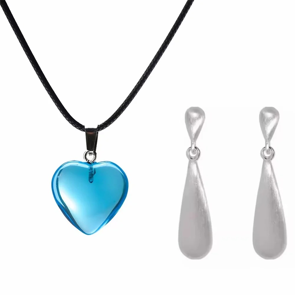 💙 Exprime la douceur et la grâce de Saja dans KPOP Demon Hunters avec ce magnifique set de bijoux composé d’un collier cœur bleu translucide et d’une paire de boucles d’oreilles argentées en forme de goutte.