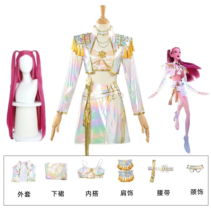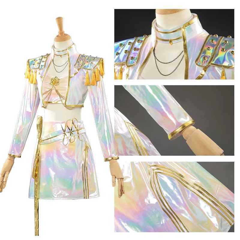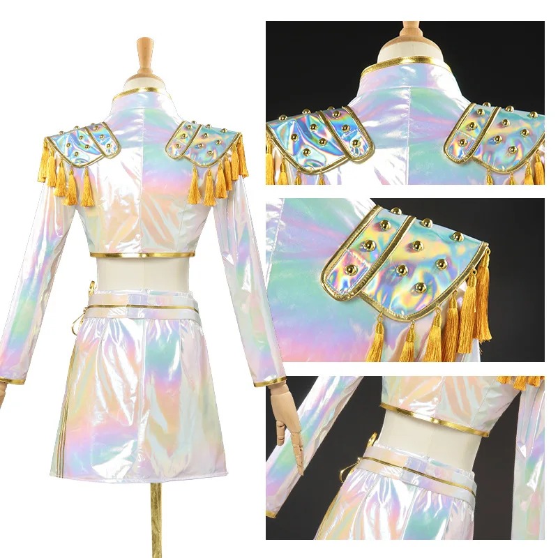 Fabriqué dans un tissu blanc réfléchissant de qualité supérieure, ce costume capte chaque rayon de lumière pour offrir un effet holographique unique — parfait sous les projecteurs ou les flashs. Les finis dorés, les épaulettes à franges, et les chaînes décoratives traduisent toute la richesse visuelle de l’univers KPOP Demon Hunter.