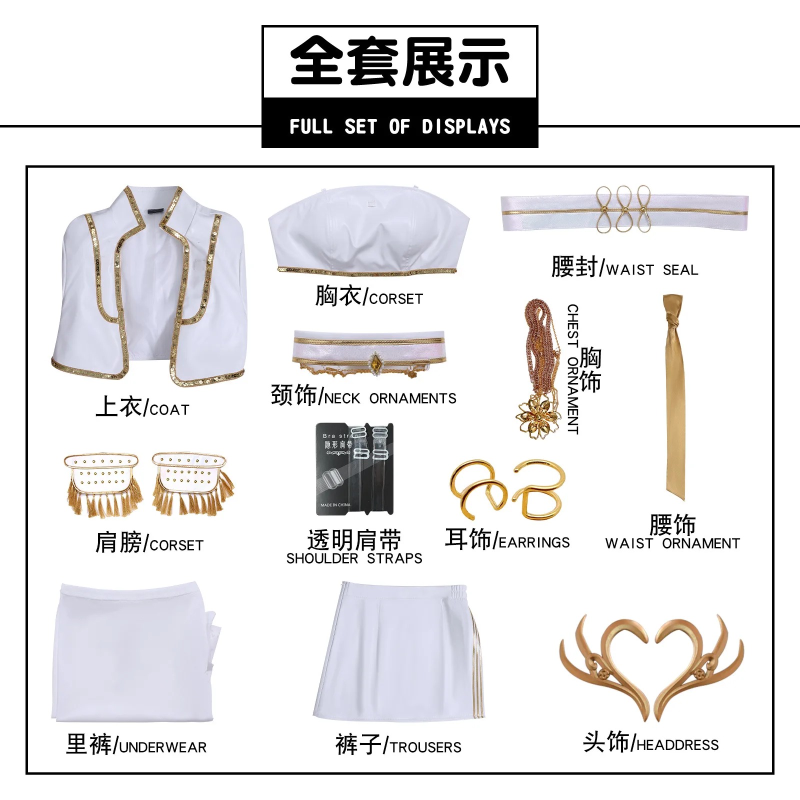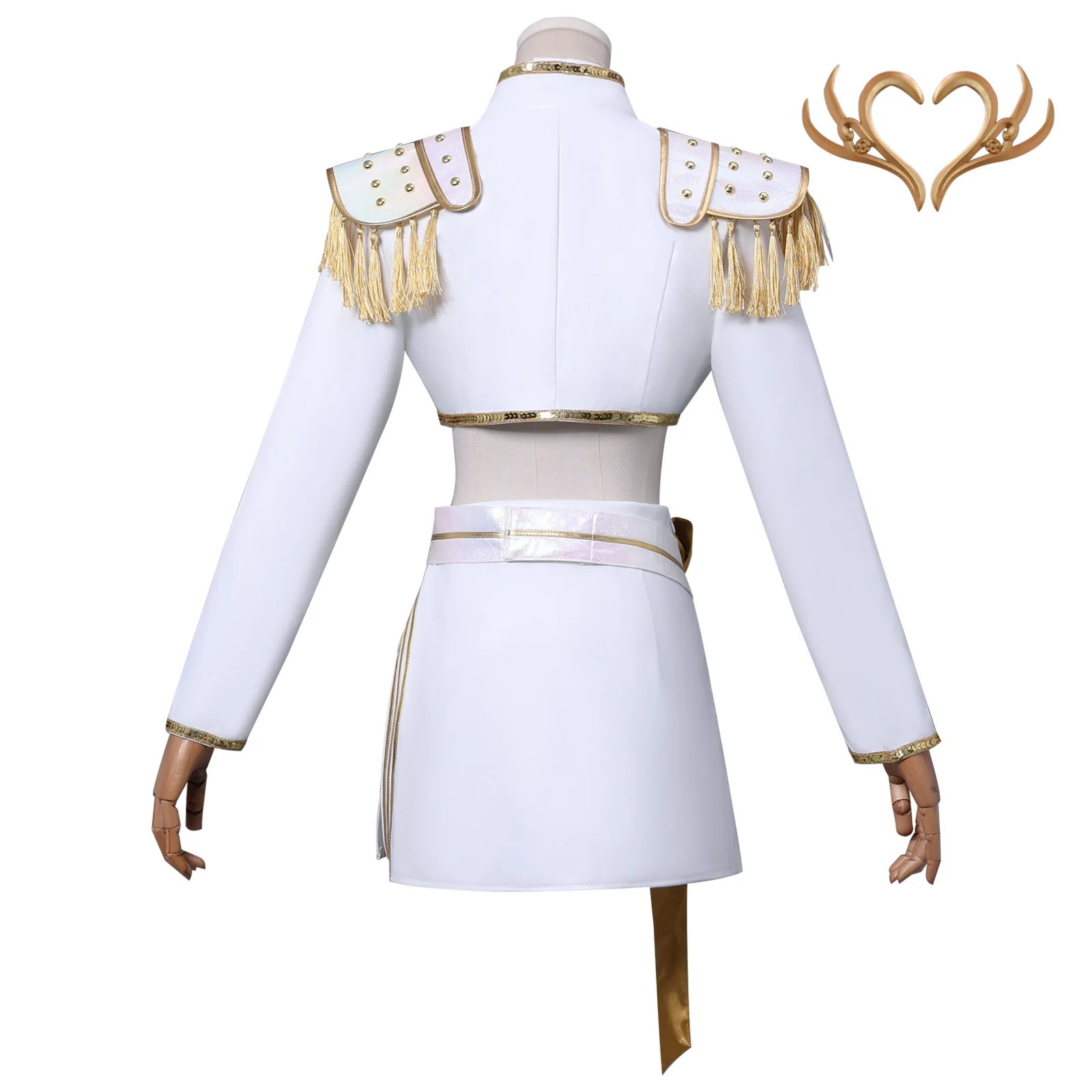 Conçu à partir de matériaux de qualité supérieure (tissu PU blanc, finitions dorées et accessoires métalliques), l’uniforme capture toute la lumière et la prestance des héroïnes du film. Les épaulettes à franges dorées, les bijoux raffinés et les ornements de taille rappellent l’esthétique sophistiquée de l’univers KPOP Demon Hunter.