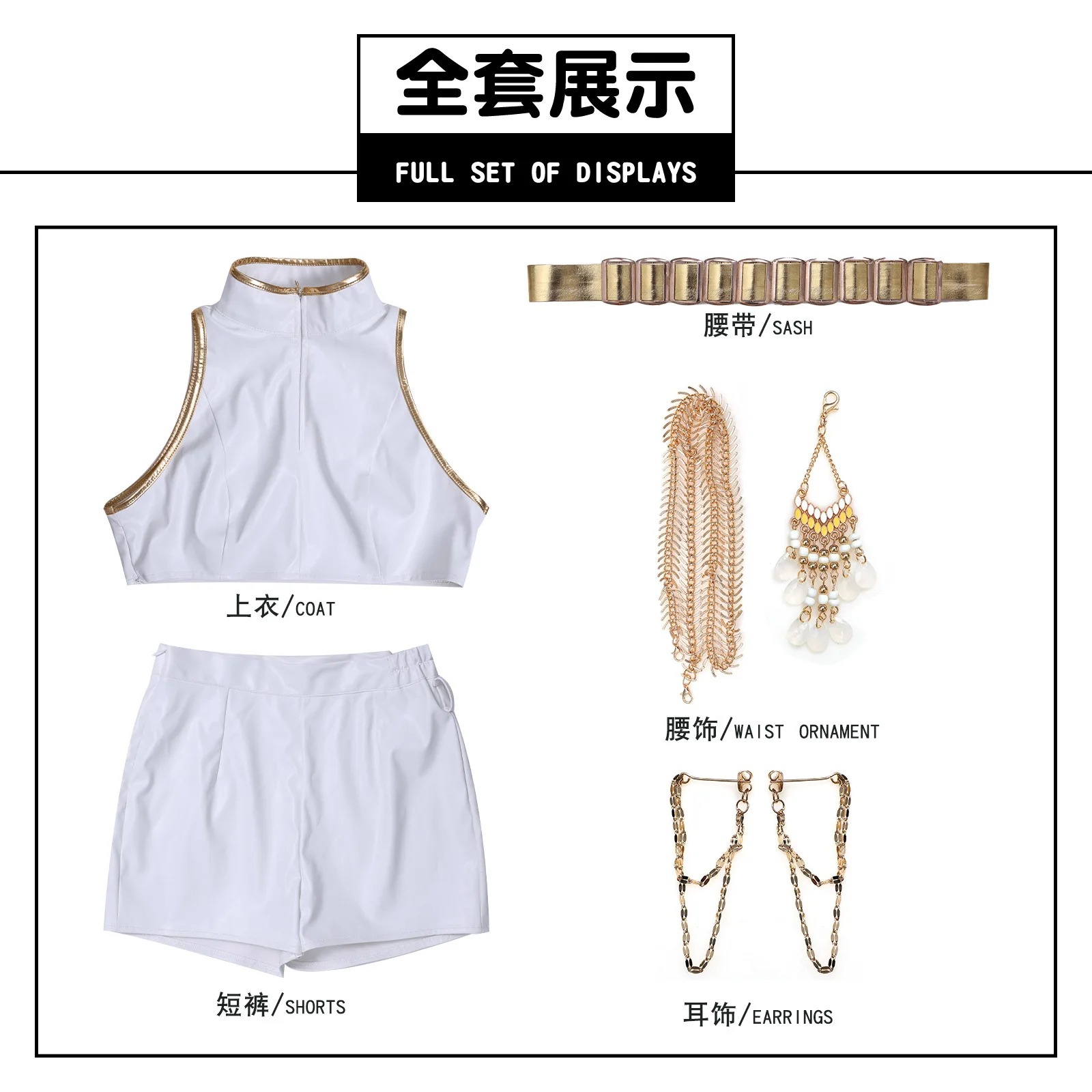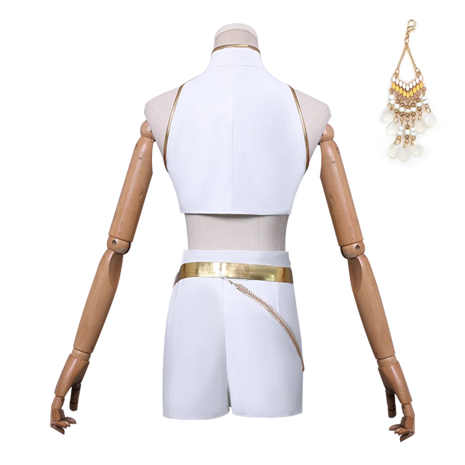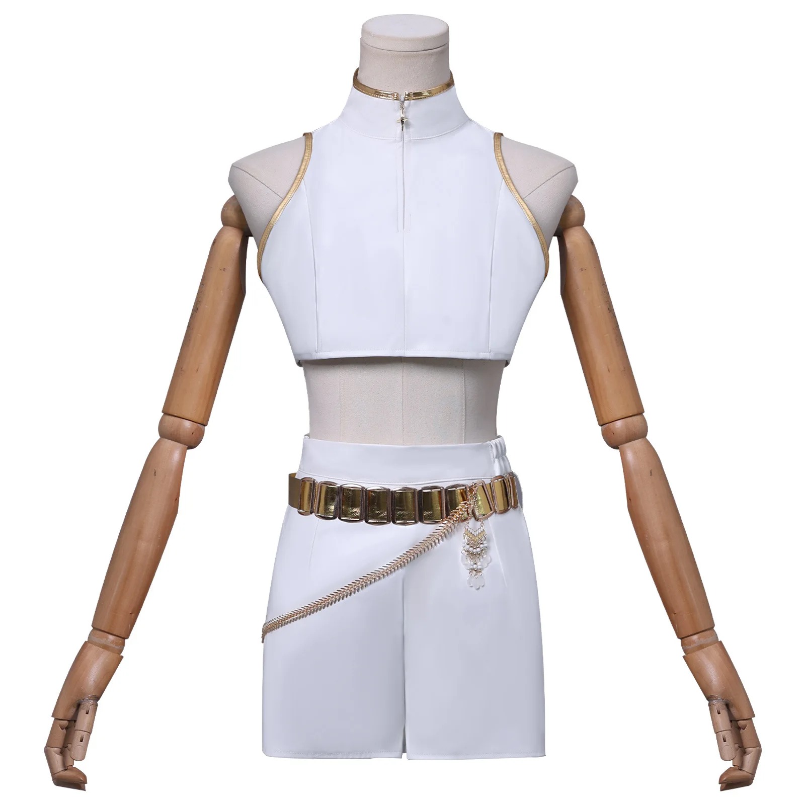 Réalisé en tissu PU blanc haut de gamme, l’uniforme épouse parfaitement les lignes du corps tout en reflétant la lumière grâce à ses finitions dorées. Chaque détail — de la ceinture sculptée à la chaîne de taille — évoque l’esthétique raffinée et dynamique de KPOP Demon Hunter.