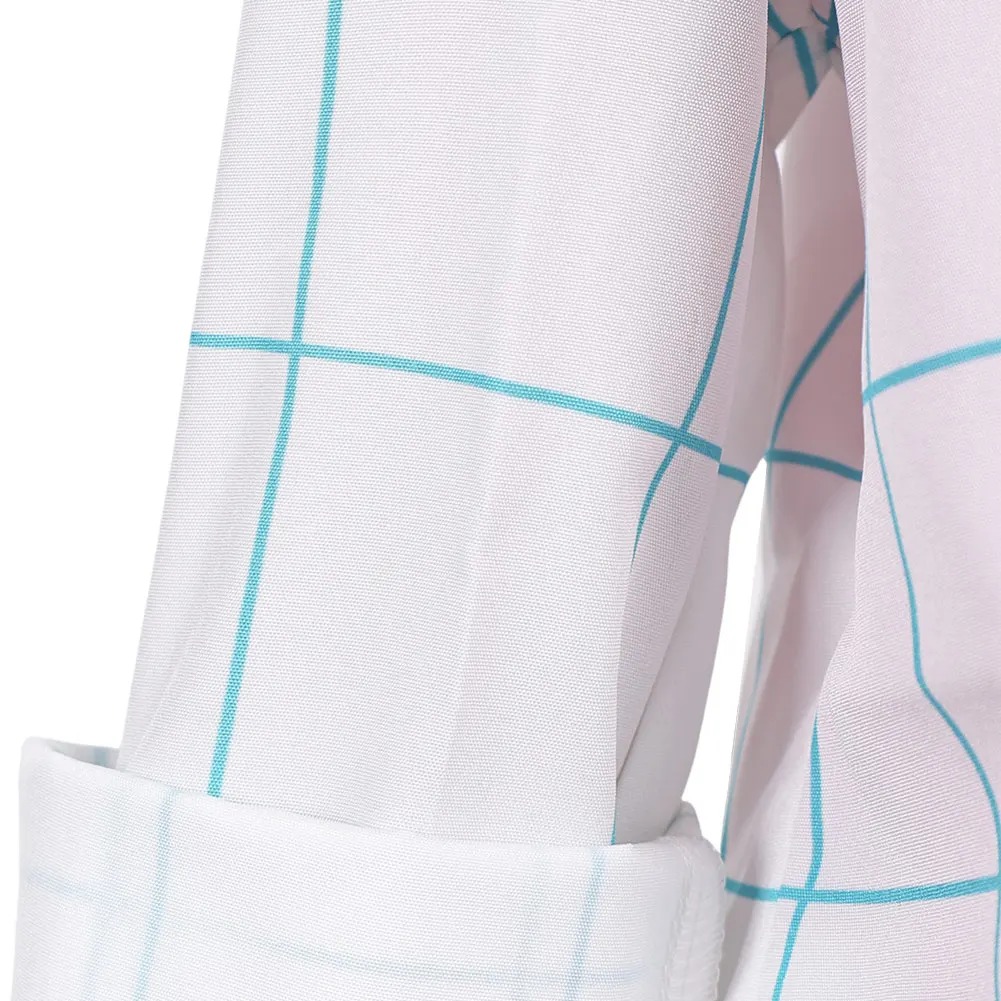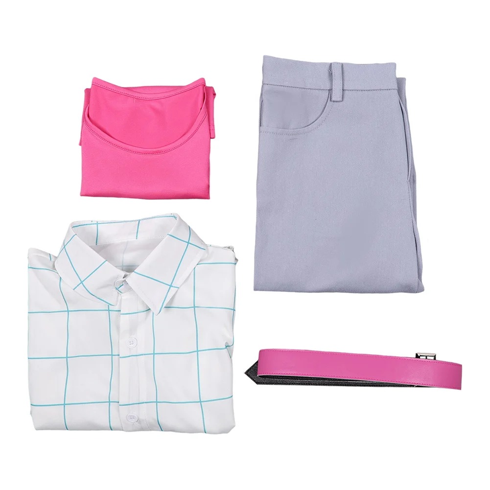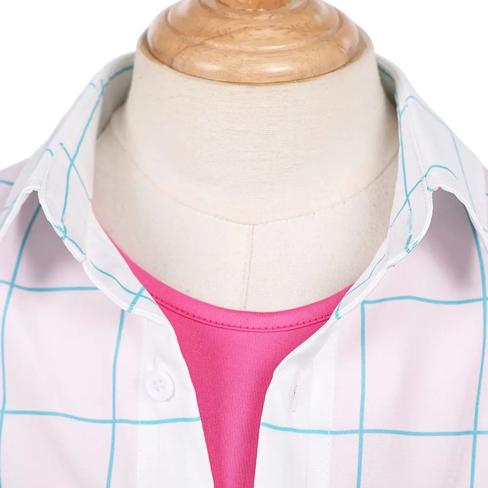 La tenue reprend les codes vestimentaires de la série K-pop Demon Hunters, avec une chemise blanche à carreaux bleus, un t-shirt rose vif, un pantalon gris clair et une ceinture assortie.