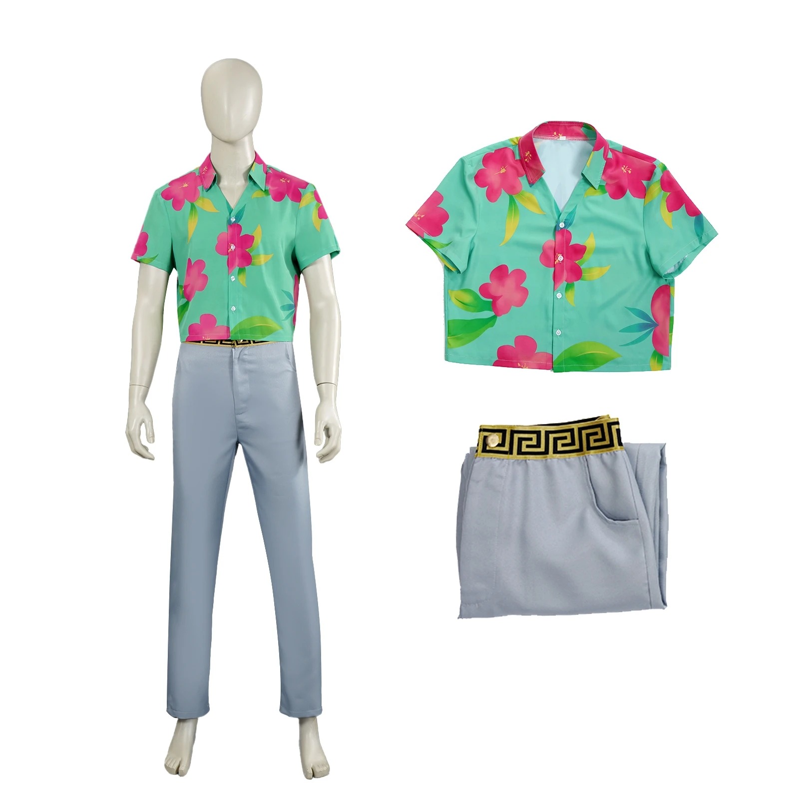 Ensemble complet avec chemise fleurie, pantalon, perruque et bonnet. Parfait pour cosplay, Halloween ou convention.