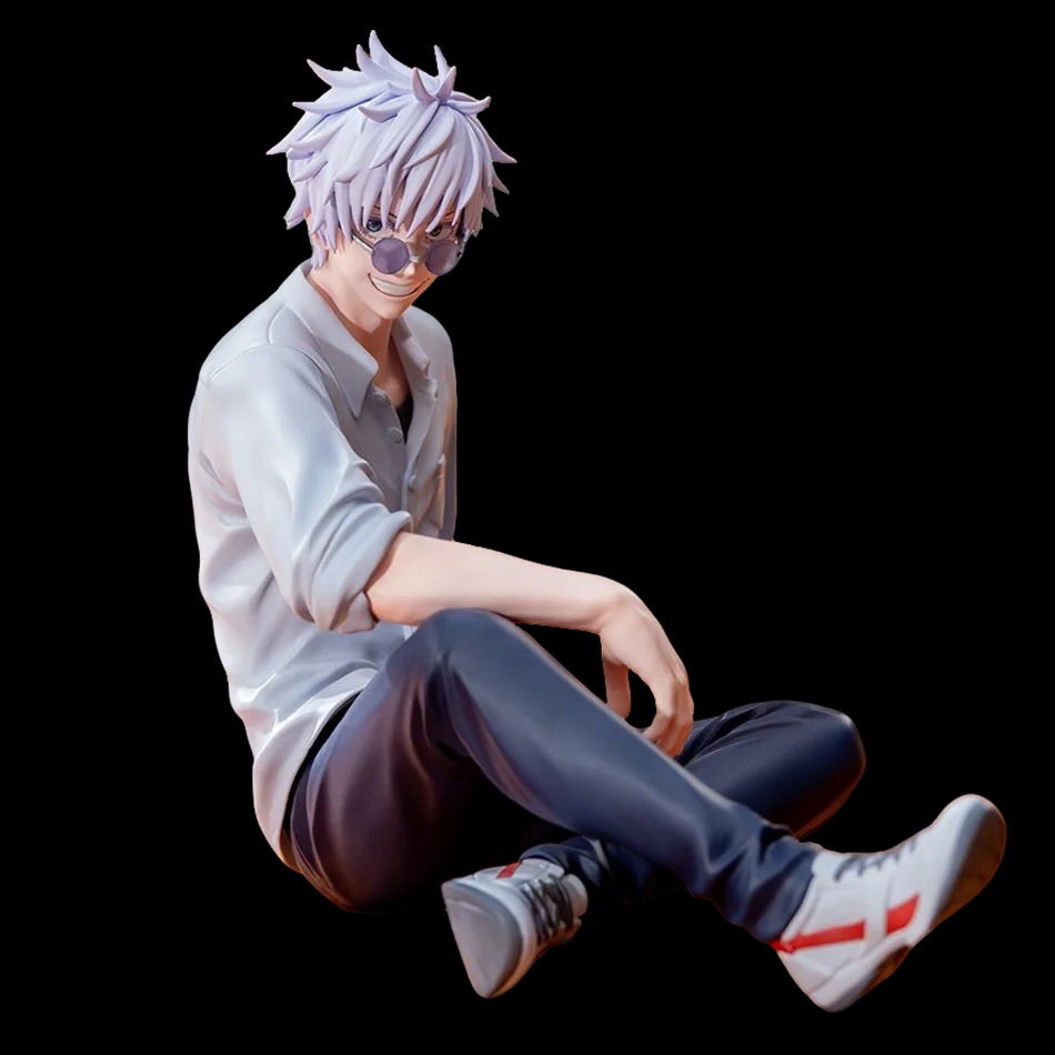 La figurine présente Gojo assis, une jambe repliée et le buste légèrement incliné, dans une posture détendue mais assurée. Cette position transmet une impression de contrôle total, fidèle à sa personnalité. Le visage est finement sculpté, avec une expression sereine et confiante. Les lunettes rondes teintées, élément emblématique du personnage, sont parfaitement intégrées et renforcent immédiatement son identité visuelle.