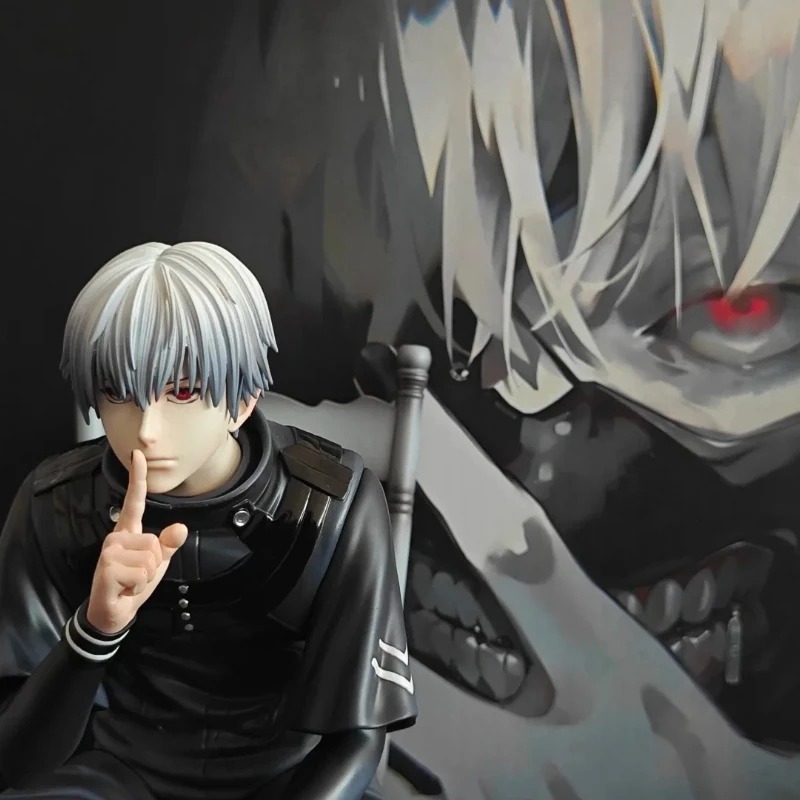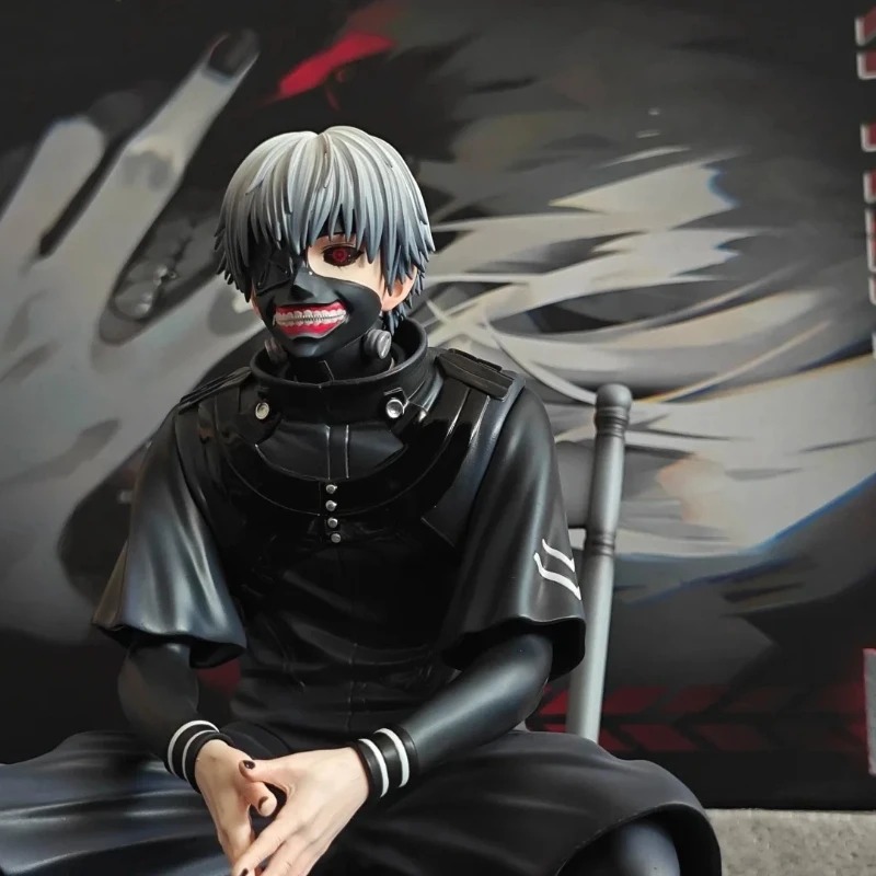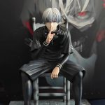 La figurine représente Kaneki assis sur une chaise, légèrement penché vers l’avant, doigt posé près du visage, dans une attitude à la fois calme et menaçante. L’arrière-plan visuel et la base renforcent l’ambiance sombre propre à Tokyo Ghoul. Le contraste entre le noir profond de la tenue et la pâleur du visage accentue le caractère dramatique de la scène.